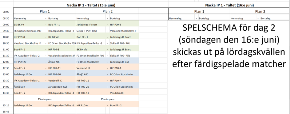 Lag IFK Aspudden Tellus 1: Samling 16/6 13:00, Skuru IP Lag: Leon M, Sebastian, Ludwig, Hannes, Josef, Hugo, Tomasz, Alvar, Ben, Elias Ledare: Jonas 13.30 IFK Aspudden-Tellus 1 vs Älvsjö 14.30 Sickla vs IFK Aspudden-Tellus 1 15.30 Hammarby vs IFK Aspudden-Tellus 1 Lag IFK Aspudden Tellus 2: Samling 16/6 13:30, Skuru IP Lag: Max, Einar, Elliot, Emanuele, Emil, Noah, Elmer, Vincent, Oscar Ledare: Henrik 14.00 BK BK Vit vs IFK Aspudden-Tellus 2 15.00 IFK Aspudden-Tellus 2 vs Jarlaberg 16.00. IFK Aspudden-Tellus 2 vs Boo FF