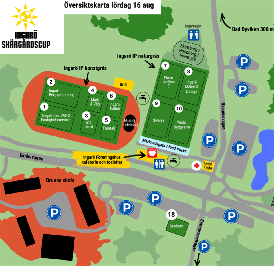 Hej! Nu på lördag eftermiddag spelar vi Ingarö skärgårdscup! På naturgräs! Det blir en rivstart på höstsäsongen innan vi sparkar igång med träningarna som vanligt nästa vecka. Viss risk för regn del av lördagen så bra med nån regnjacka utifall att. Matcherna spelas 2x15 minuter. Samling 11:50 lördag 16/8 vid plan 9 (se karta via länk nedan eller postbild). Laget Ellen Oskara Aneley Hilda Lea Ingrid Emelie Niki Dagny Cali Wilma Henric och Daniel är med på cupen. Matcher 12:20 AT - Mörtnäs IF, plan 9 13:40 Boo FF - AT, plan 9 15:40 AT - Ursvik IK, plan 7 17:00 DIF - AT, plan 9 Övrigt - Medtag badkläder! Det finns en fin badstrand ett par minuters promenad bort. - Parkering! Det är stor risk för att det är dåligt med parkeringsplats så ta höjd för detta ni som åker bil. Länk till cupens hemsida: https://www.ingaroskargardscup.se/ Behöver ni skjuts? Frågor/kommentarer? Kontakta någon av oss tränare eller kommentera nedan. Postbild: karta över cupområdet (del av). Mvh /Tränarna